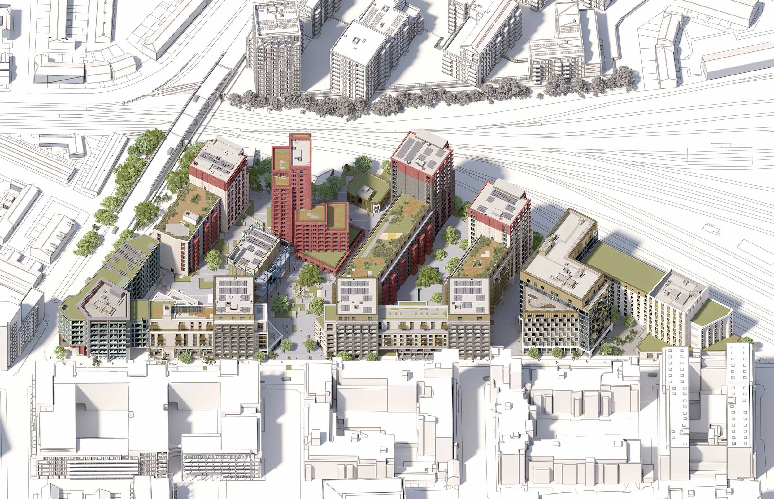 The main public square at the heart of the development is animated by a mix of uses at ground floor with a rich vibrancy on offer across the site.